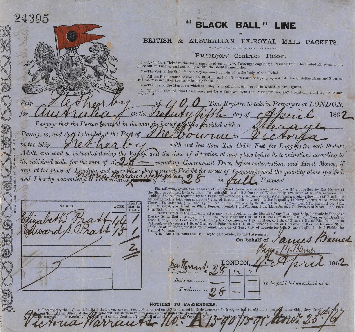 Passenger contract ticket for Elizabeth Pratt (aged 44) and her son Edward (aged 15) for steerage passage from London to Melbourne on the Black Ball Line clipper ship 'Netherby', departing 25 April 1862. The cost of the ticket was £28 paid in full. Printed by Rees & Roberts, 'Lombard Press' 38, Gracechurch Street, City. The ship arrived in Melbourne on 3 August 1862.