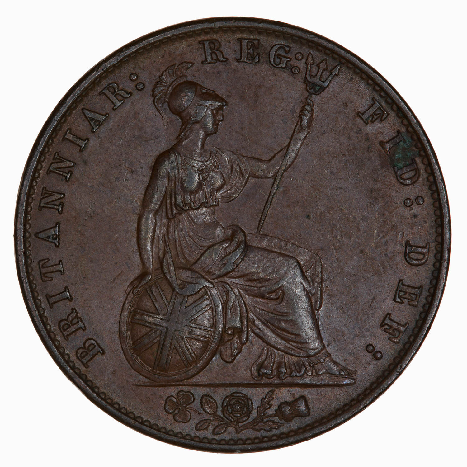 Britannia seated facing right on a rock holding a trident and resting her right hand on an oval shield which bears the three crosses of the Union Flag; around, BRITANNIAR: REG: FID: DEF:; in exergue, a rose, thistle and shamrock combined.