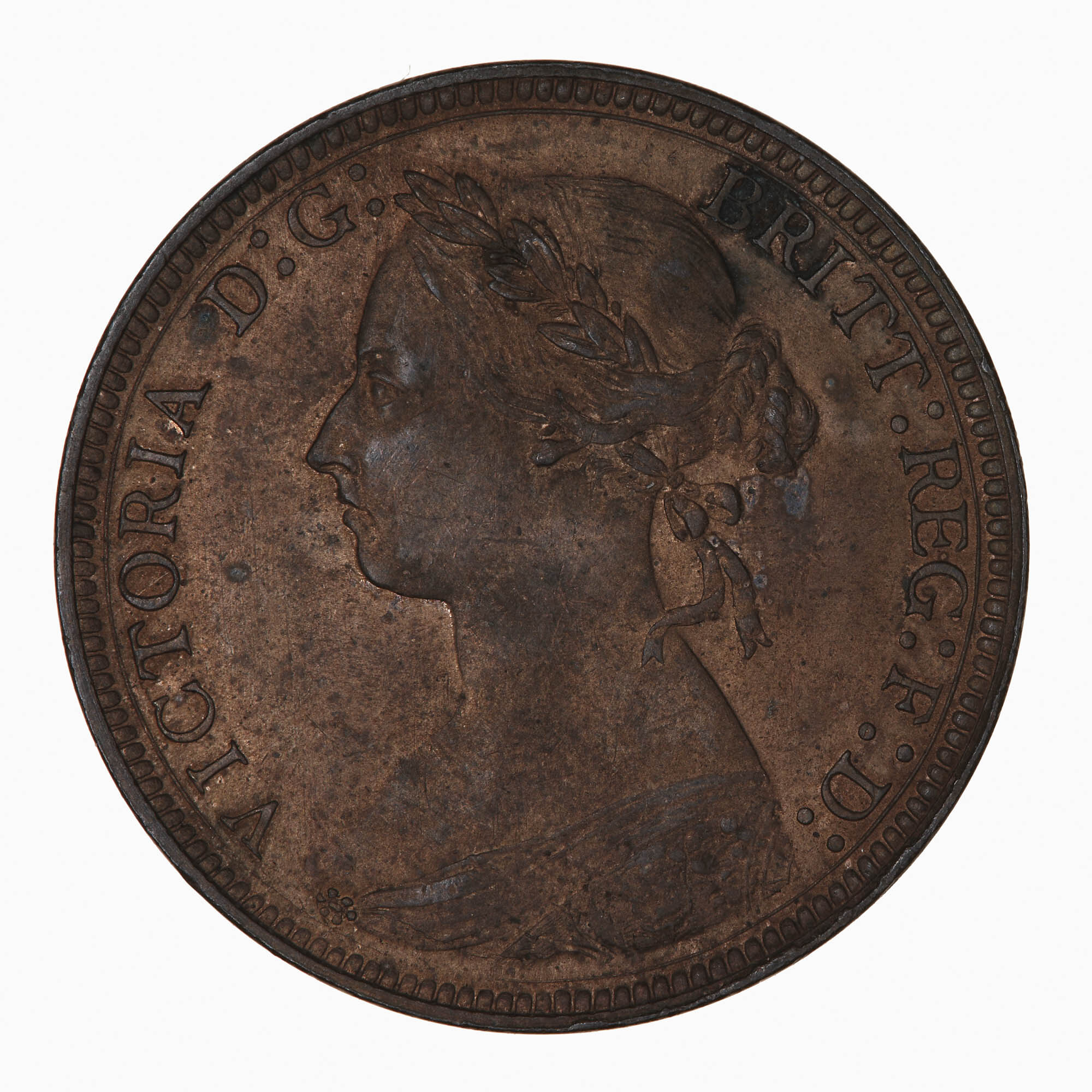 Britannia seated facing right on a rock wearing a helmet and breastplate with flowing dress; she holds a trident and rests her right hand on a shield which bears the combined crosses of the Union Flag; at right a ship sailing away; at left, a lighthouse; around, HALF PENNY; in exergue, 1884