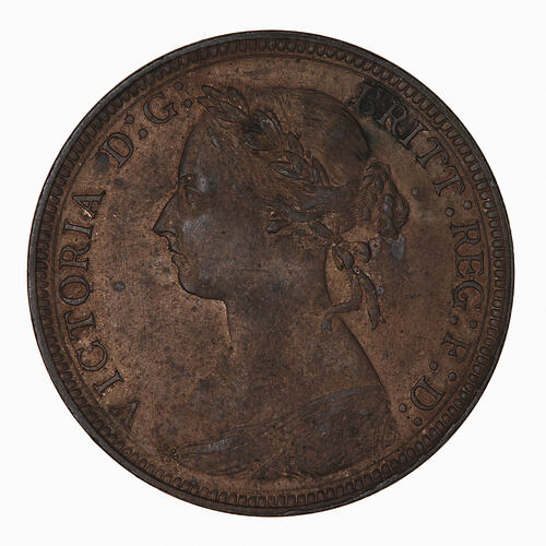 Bust of Queen Victoria facing left wearing bodice and a mantle decorated with rose, thistle and shamrock; in her hair a wreath of leaves and berries tied at back with ribbon, her hair drawn to a plaited bun behind, she wears a pearl brooch; around, VICTORIA D: G: BRITT: REG: F: D: