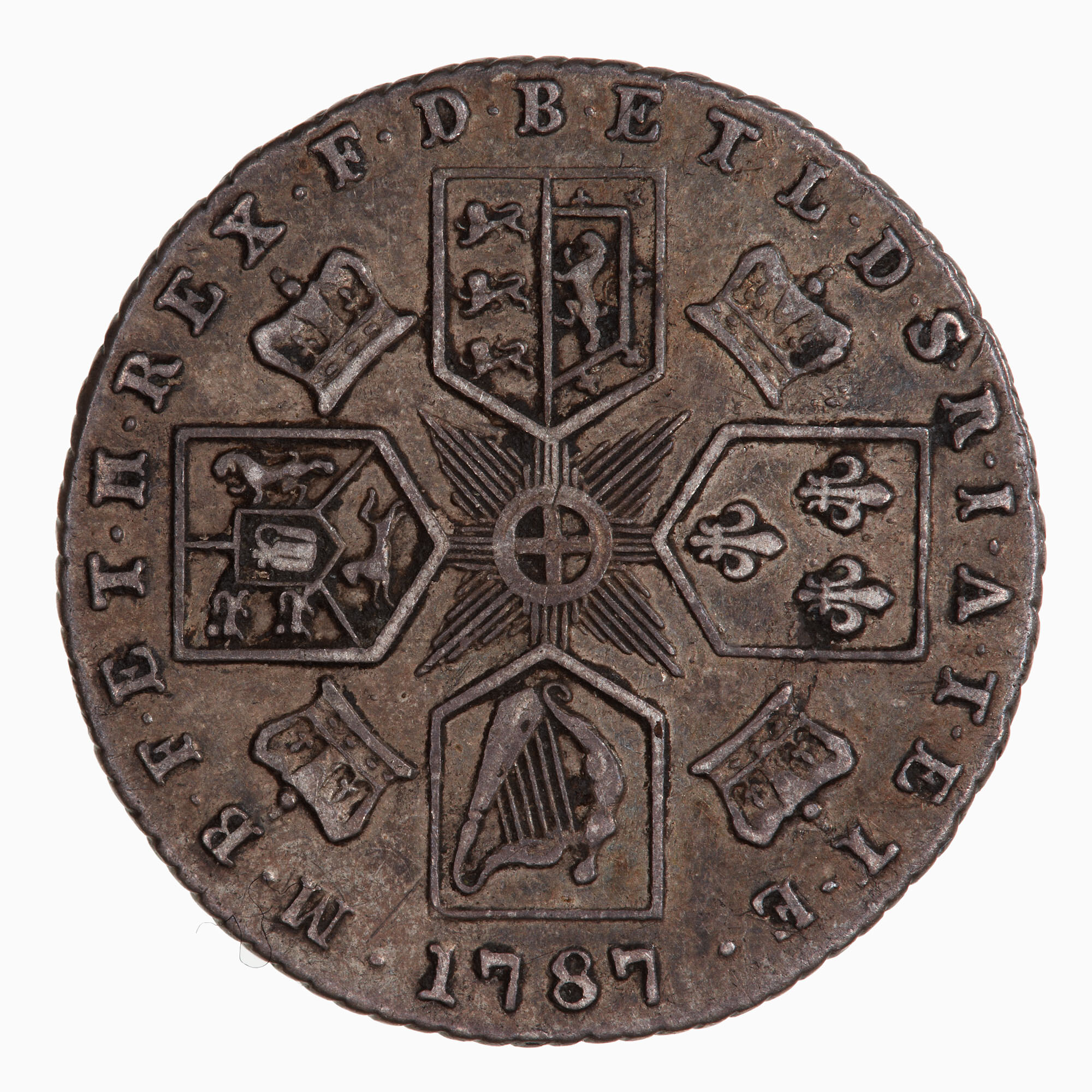Four shields arranged to form a cross with the Star of the Garter at its centre; between arms of cross, a crown; around, M B F ET H REX F D B ET L D S R I A T ET E 1787, the date being below the shield containing Irish arms. No semee of hearts in Hanoverian shield.