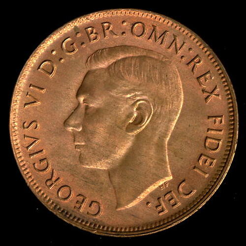 A bronze coin (30.8 mm diameter with plain edge) featuring a bare head of George VI facing left; around, GEORGIVS VI D:G: BR: OMN: REX FIDEI DEF. ; below head in small lettering the artist's initials HP. The reverse features a kangaroo leaping to the left; around above AUSTRALIA, around below, PENNY; the Federation star is in the field to the left of the kangaroo and the date, 1952 is in the field below its tail. The artist's initials KG are above the tip of the tail.