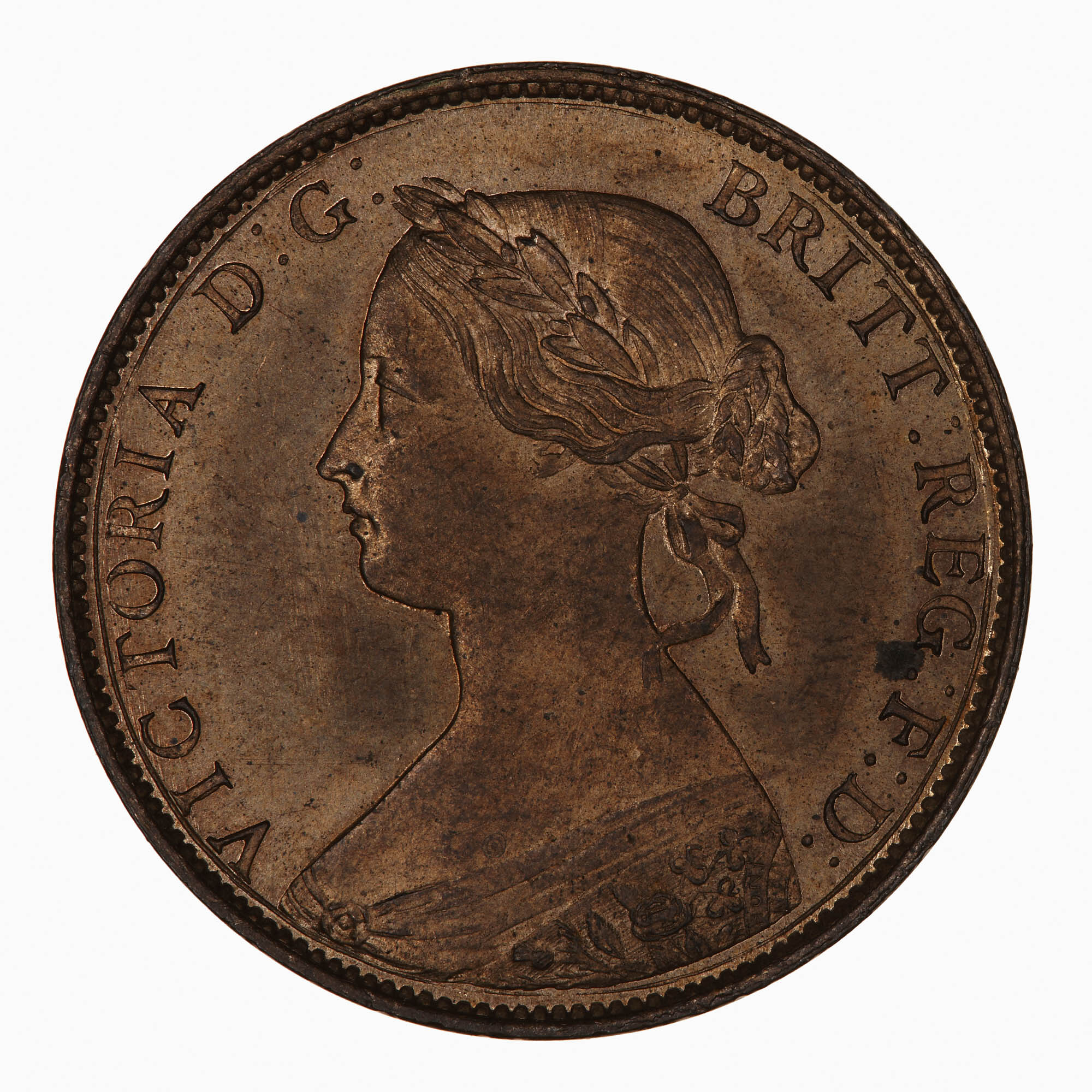 Bust of Queen Victoria facing left wearing bodice and a mantle decorated with rose, thistle and shamrock; in her hair a wreath of leaves and berries tied at back with ribbon, her hair drawn to a plaited bun behind, she wears a circular broach; around, VICTORIA D: G: BRITT: REG: F: D: