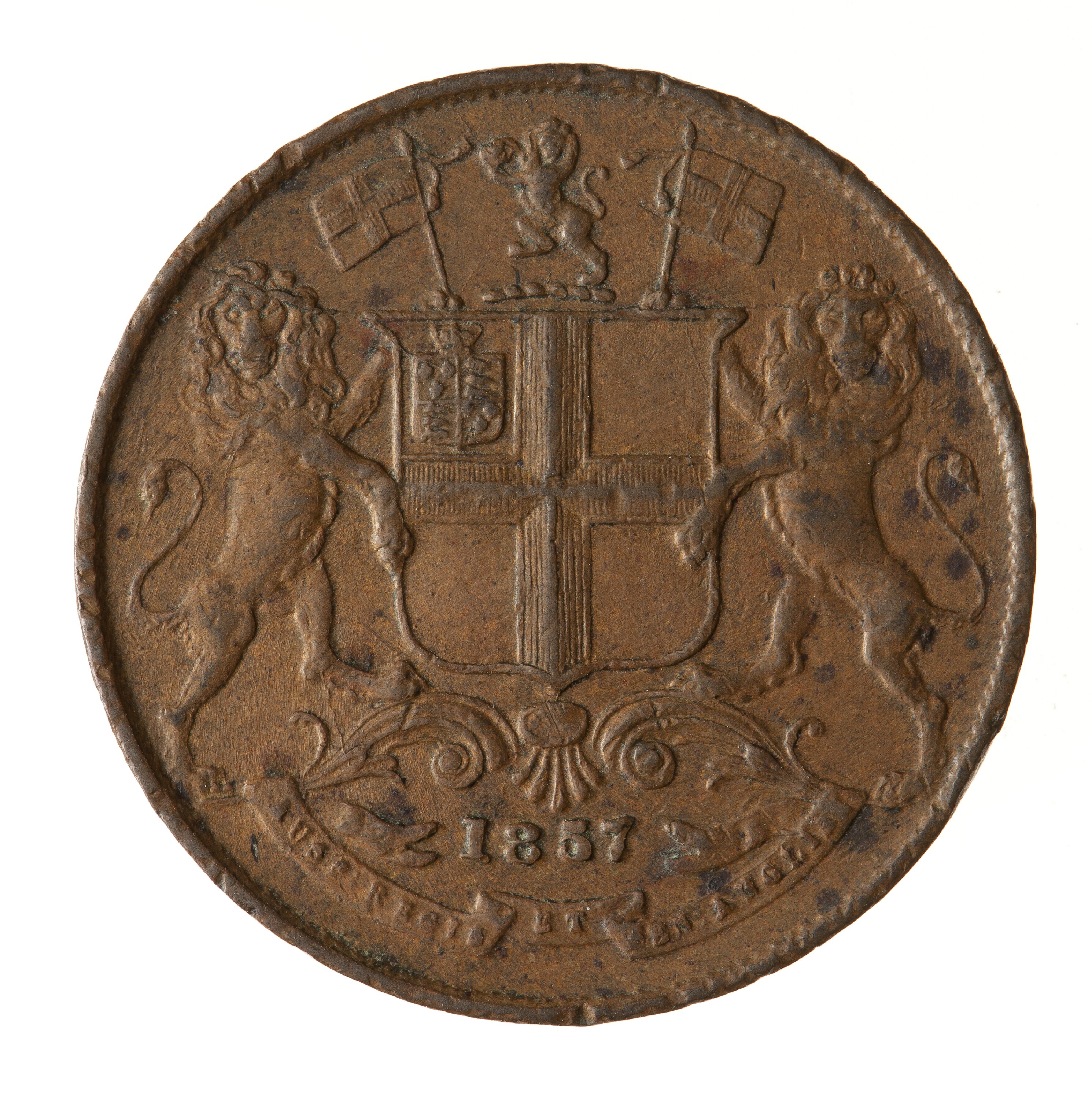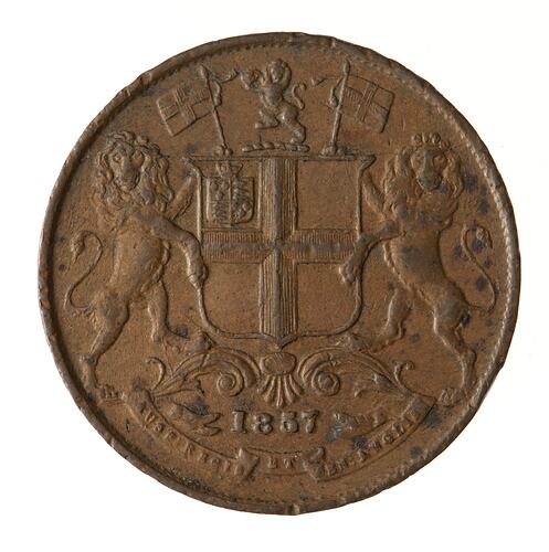 East India Company arms, a shield quartyered with eschutcheon of France and England in the first quarter; crest of a lion rampant guardant holding between his forepaws the imperial crown proper; with supporters two lions rampant guardant each supporting a banner charged with a cross; below on a ribbon the motto, 'AUSP: REG: & SEN: ANG:' (translation: under the auspices of the king and senate of England); above ribbon, '1857''.