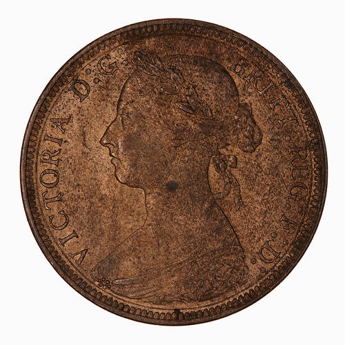 Bust of Queen Victoria facing left wearing bodice and a mantle decorated with rose, thistle and shamrock; in her hair a wreath of leaves and berries tied at back with ribbon, her hair drawn to a plaited bun behind, she wears a pearl brooch; around, VICTORIA D: G: BRITT: REG: F: D: