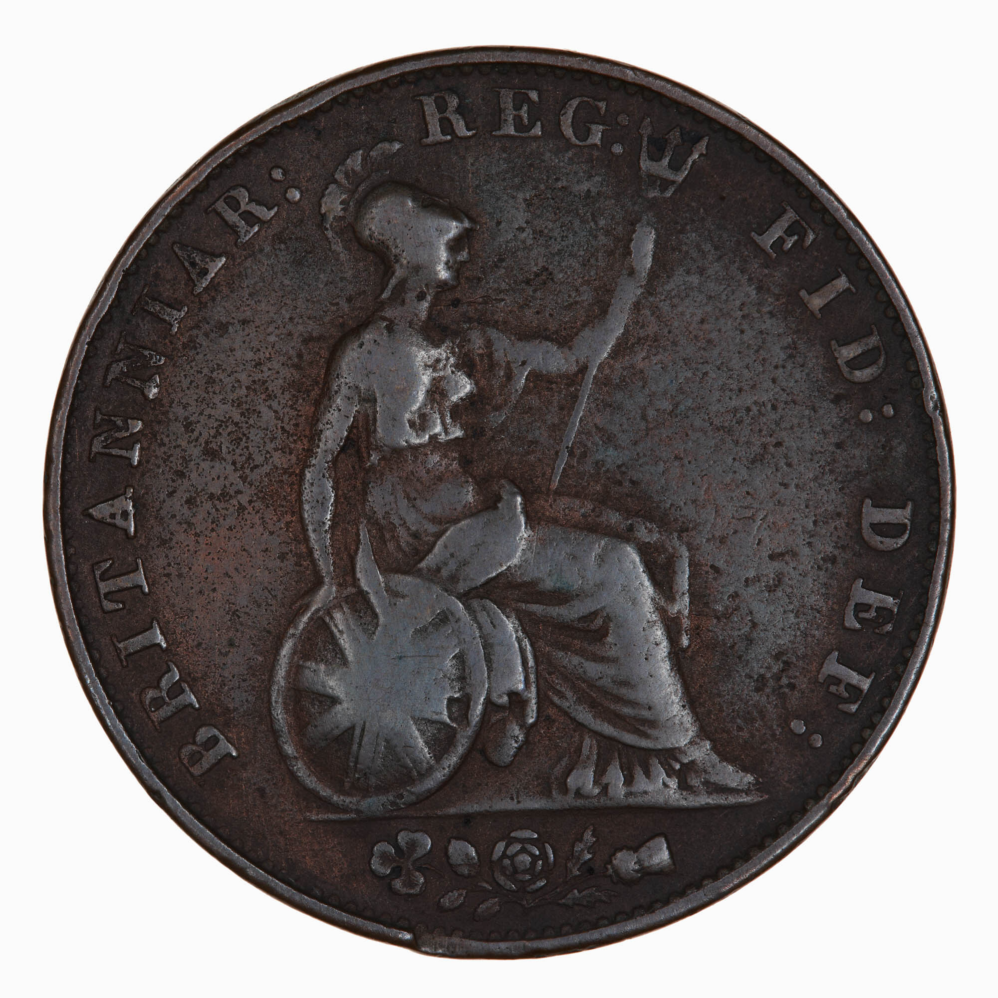 Britannia seated facing right on a rock holding a trident and resting her right hand on an oval shield which bears the three crosses of the Union Flag; around, BRITANNIAR: REG: FID: DEF:; in exergue, a rose, thistle and shamrock combined.