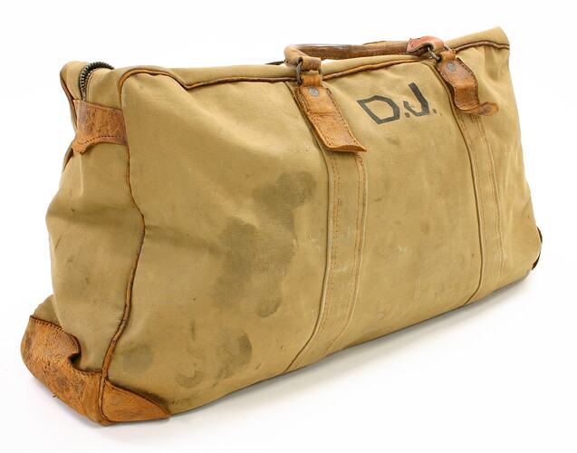 Luggage bag made from canvas and leather issued by the Women's Royal Naval Service (WRENS) to Daphne (Joule) Armstrong, circa 1944. Daphne was a member of WRENS from 1944-1947 and her husband was in the airforce. Although the standard army issue bags were basic kit bags, Daphne was given two superior canvas bags with zips and leather handles to use during her naval service.