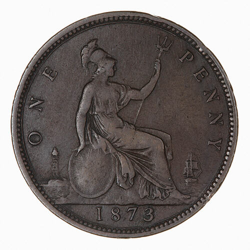 Britannia seated facing right on a rock wearing a helmet and breastplate with flowing dress; she holds a trident and rests her right hand on a shield which bears the combined crosses of the Union Flag; at right a ship sailing away; at left, a lighthouse; around, ONE PENNY; in exergue, 1873