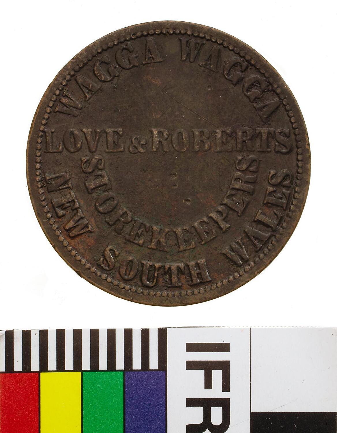 Copper One Penny Token, minted by Thomas Stokes, Melbourne. Issued by Love & Roberts, Storekeepers, Wagga Wagga, New South Wales, 1865. The earliest records of this business are two advertisements from 1866, the first for the Newtown Store Annual Stock-Taking. The second described their new stock for the 'Autumn and Winter season' and gave an extensive listing of the range of fabrics, hats and other draperies they sold. In 1867 they were listed as 'Storekeepers, Wagga Wagga' in Samson's National Directory of New South Wales for 1867.