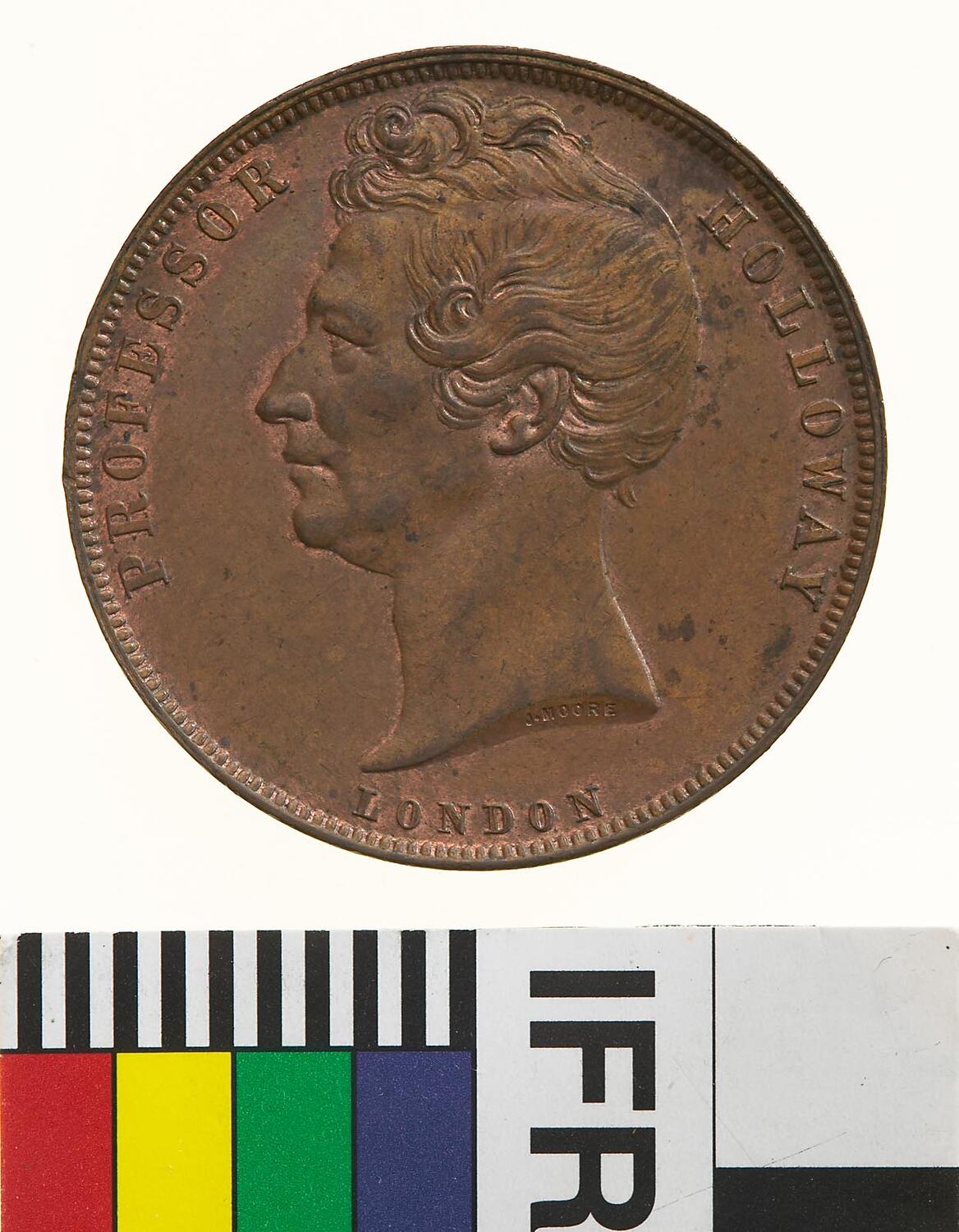 Head of Professor Holloway facing left with J. MOORE (the maker's name) incuse on neck truncation; around, PROFESSOR HOLLOWAY; below, LONDON.
