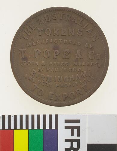 A round copper token (34 mm diameter) giving the name, address and business of the manufacturer: T. Pope & Co. St. Paul's Square, Birmingham, coin and press makers. The reverse features Britannia seated extending an olive branch with a trident resting on her left shoulder and shield resting against the rock on which she sits. The Britannia reverse is similar to that on the standard British copper coins of the era. These pieces, though promoting the profitability of exporting tokens to Australia, have been widely accepted as circulating here since the Nineteenth century. The exact mechanism for placing them into circulation is not known. It is thought that they were distributed through wholesalers in either Melbourne and/or Sydney.