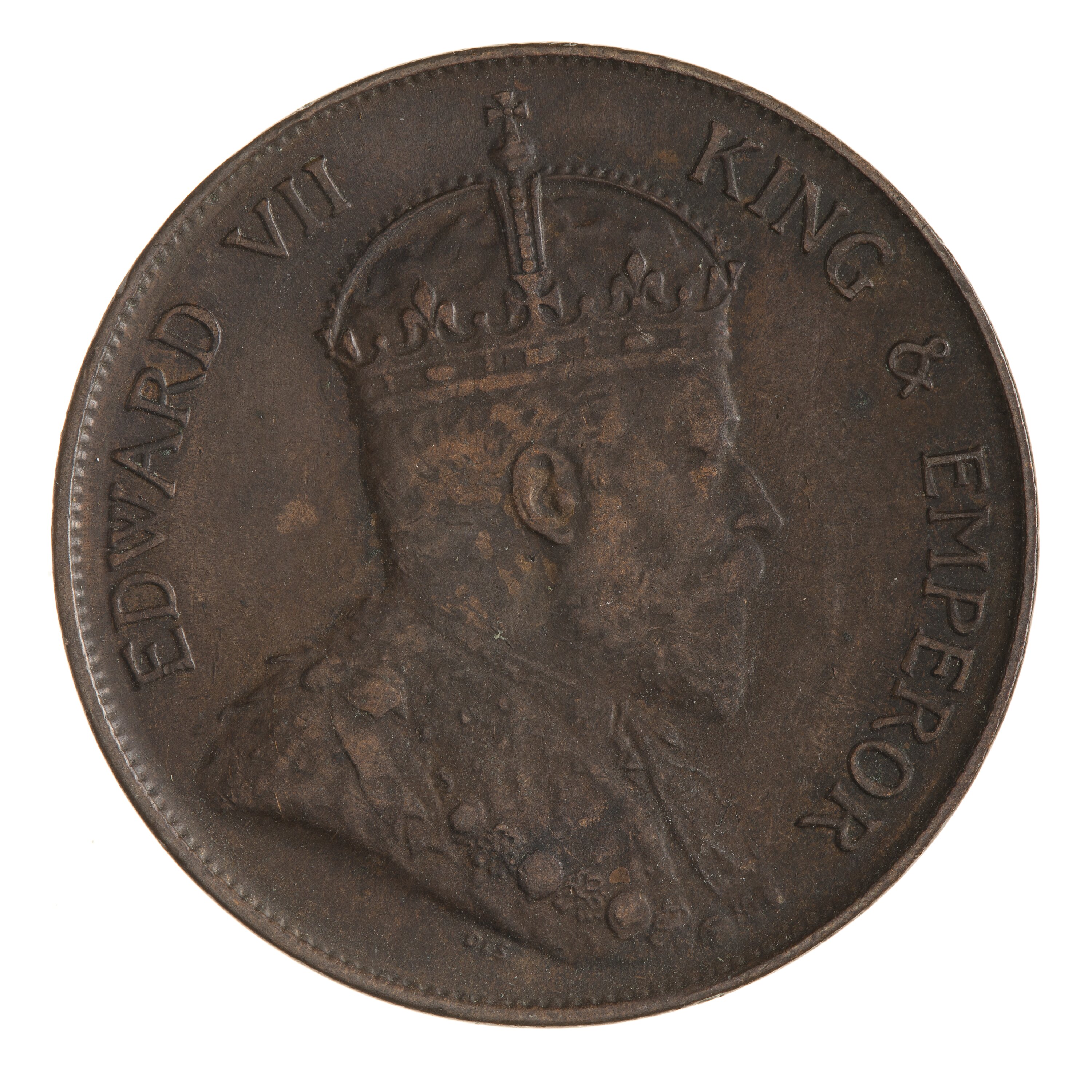 Crowned bust of the King facing left wearing an ermine robe, with the collar of the Garter; around, EDWARD VII KING & EMPEROR; artist's initials, DES, below bust