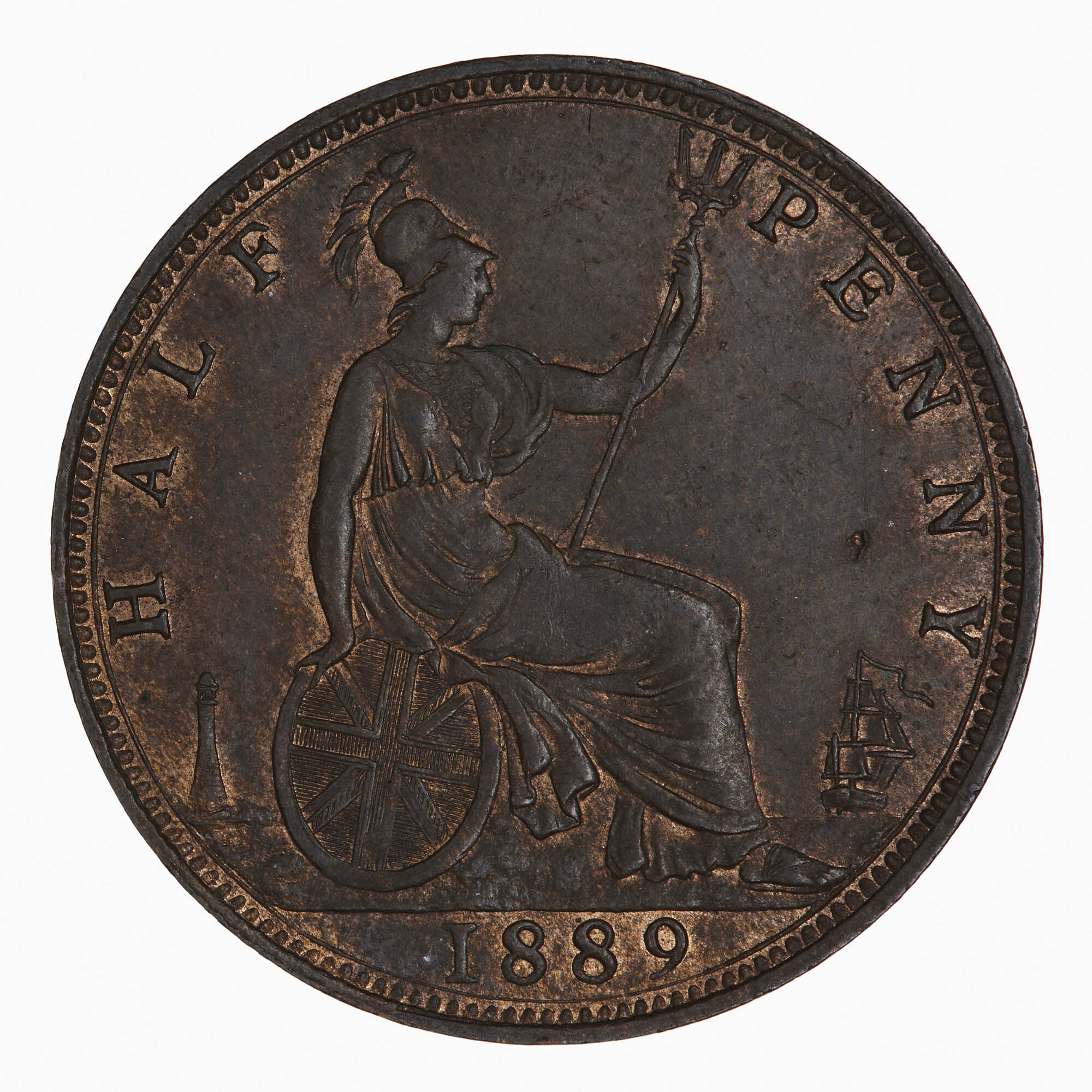 Britannia seated facing right on a rock wearing a helmet and breastplate with flowing dress; she holds a trident and rests her right hand on a shield which bears the combined crosses of the Union Flag; at right a ship sailing away; at left, a lighthouse; around, HALF PENNY; in exergue, 1889