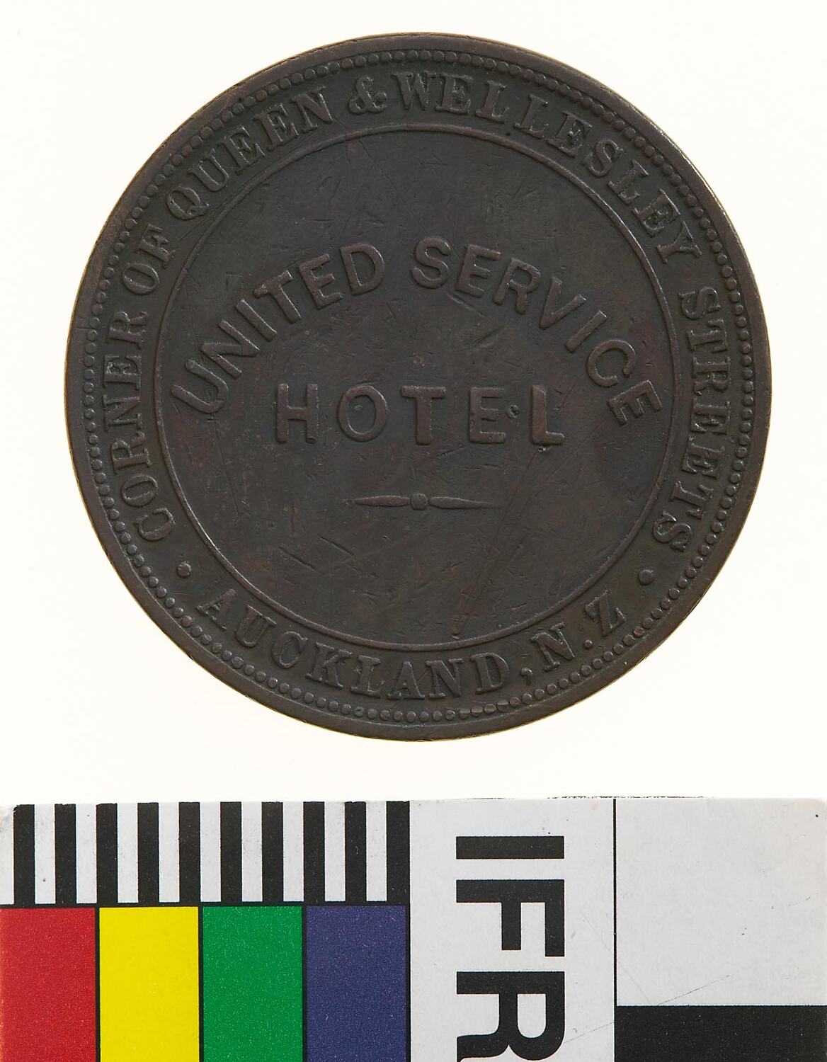 Obverse: UNITED SERVICE HOTEL CORNER QUEEN & WELLESLEY STREETS AUCKLAND N.Z. Reverse: VICTORIA DEI GRATIA 1874