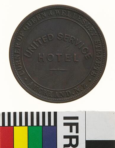 A round copper token (34 mm diameter). The token features the name, address and business of the issuer: United Service Hotel, corner of Queen and William Streets, Auckland. The reverse features a profile head of Queen Victoria and the date 1874.