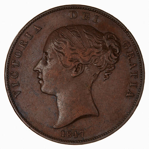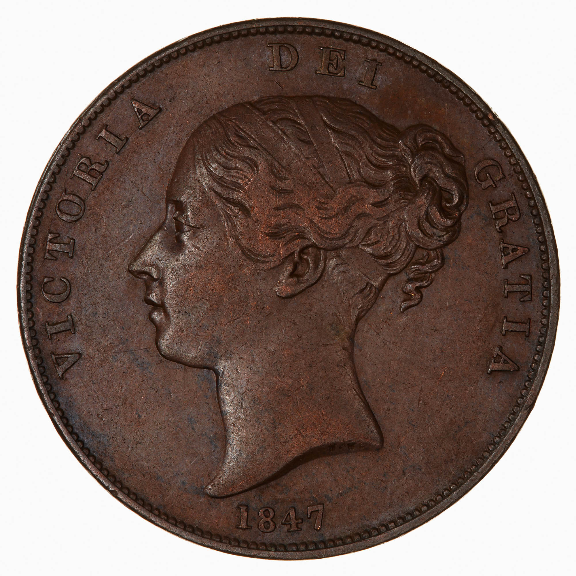 Head of Queen Victoria facing left, ribbon in her hair; incuse on neck truncation the artist's initials W.W. (William Wyon); around, VICTORIA DEI GRATIA; below, 1847
