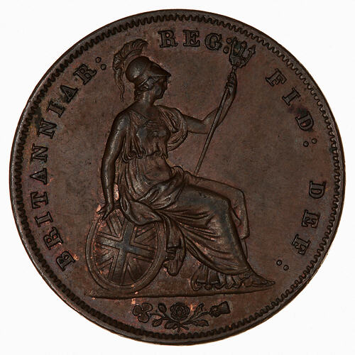 Pence of this design were in use in Victoria during the Gold Rush period. They were replaced by smaller bronze pence in 1860. Victorian Trade Tokens were based on the penny of this size.