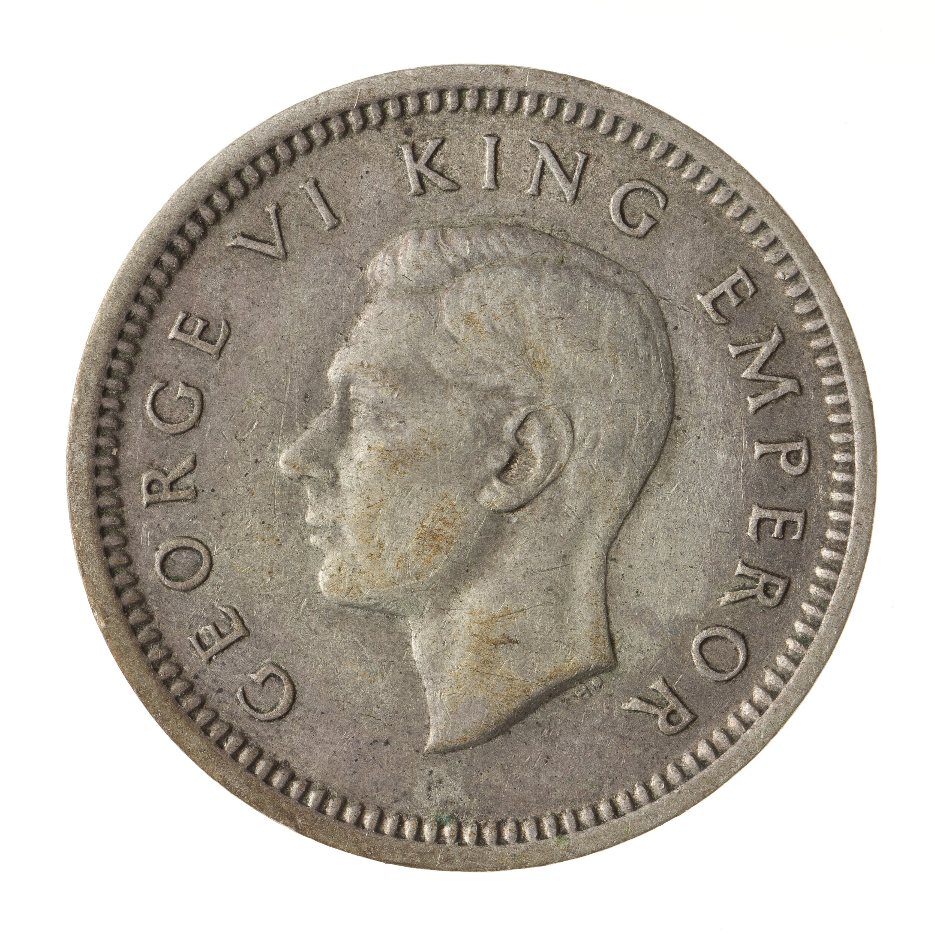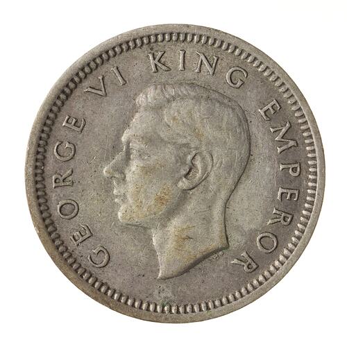 Head of King George VI facing left; around, GEORGE VI KING EMPEROR; below neck truncation the artist's initials HP (Hugh Paget)