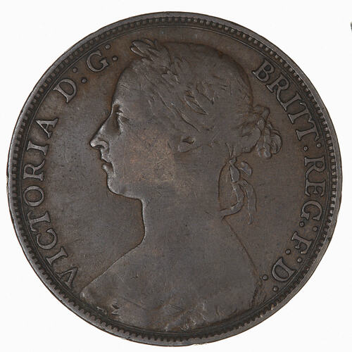 Bust of Queen Victoria facing left wearing bodice and a mantle decorated with rose, thistle and shamrock; in her hair a wreath of leaves and berries tied at back with ribbon, her hair drawn to a plaited bun behind, she wears a circular broach; around, VICTORIA D: G: BRITT: REG: F: D: