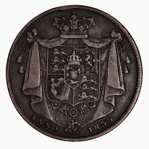 Crowned shield bearing the Royal Arms on mantle, at base, the Collar of the Garter; around below, ANNO 1835