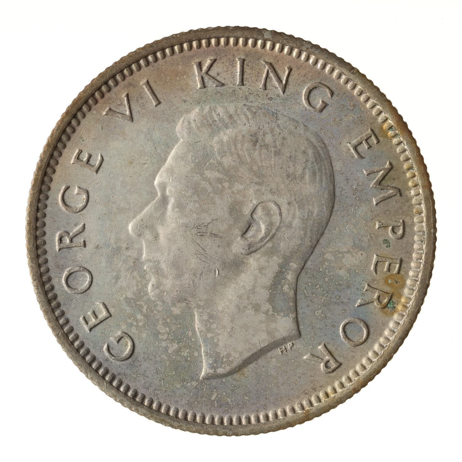 King's head, bare, facing left; around, GEORGE VI KING EMPEROR; below neck truncation in small letters the artist's initials HP ([Thomas] Humphrey Paget)