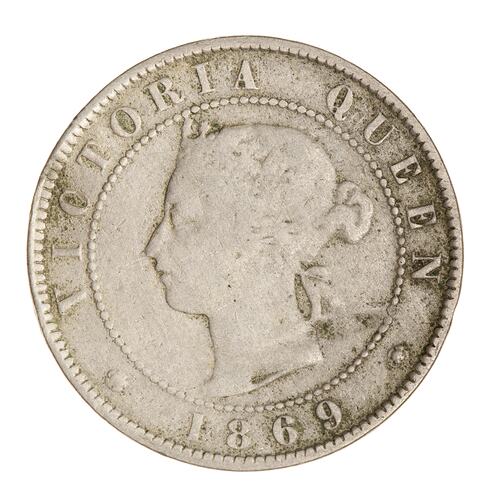Within a beaded circle, a diademed head of the Queen facing left; around, VICTORIA QUEEN; below between two roses, 1869