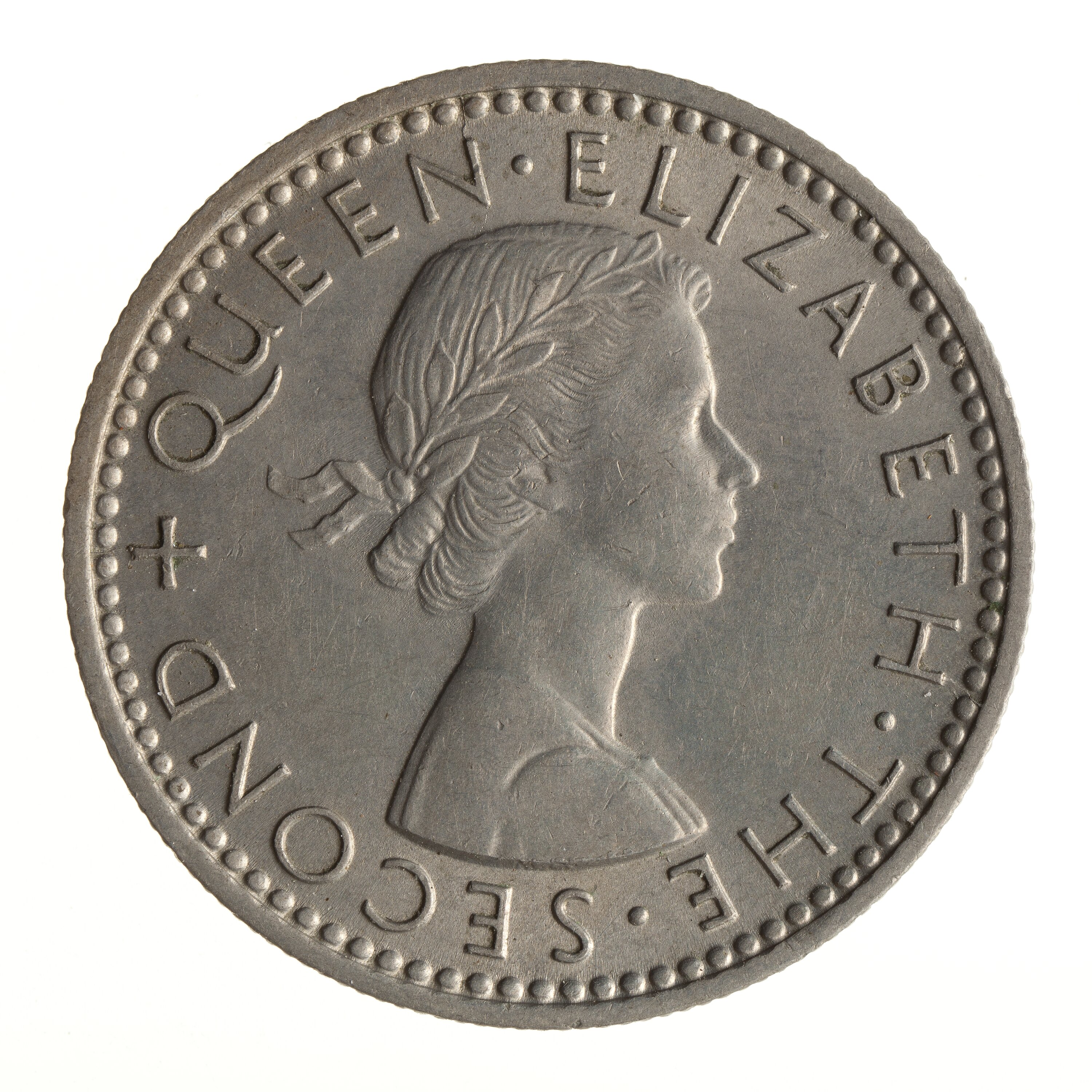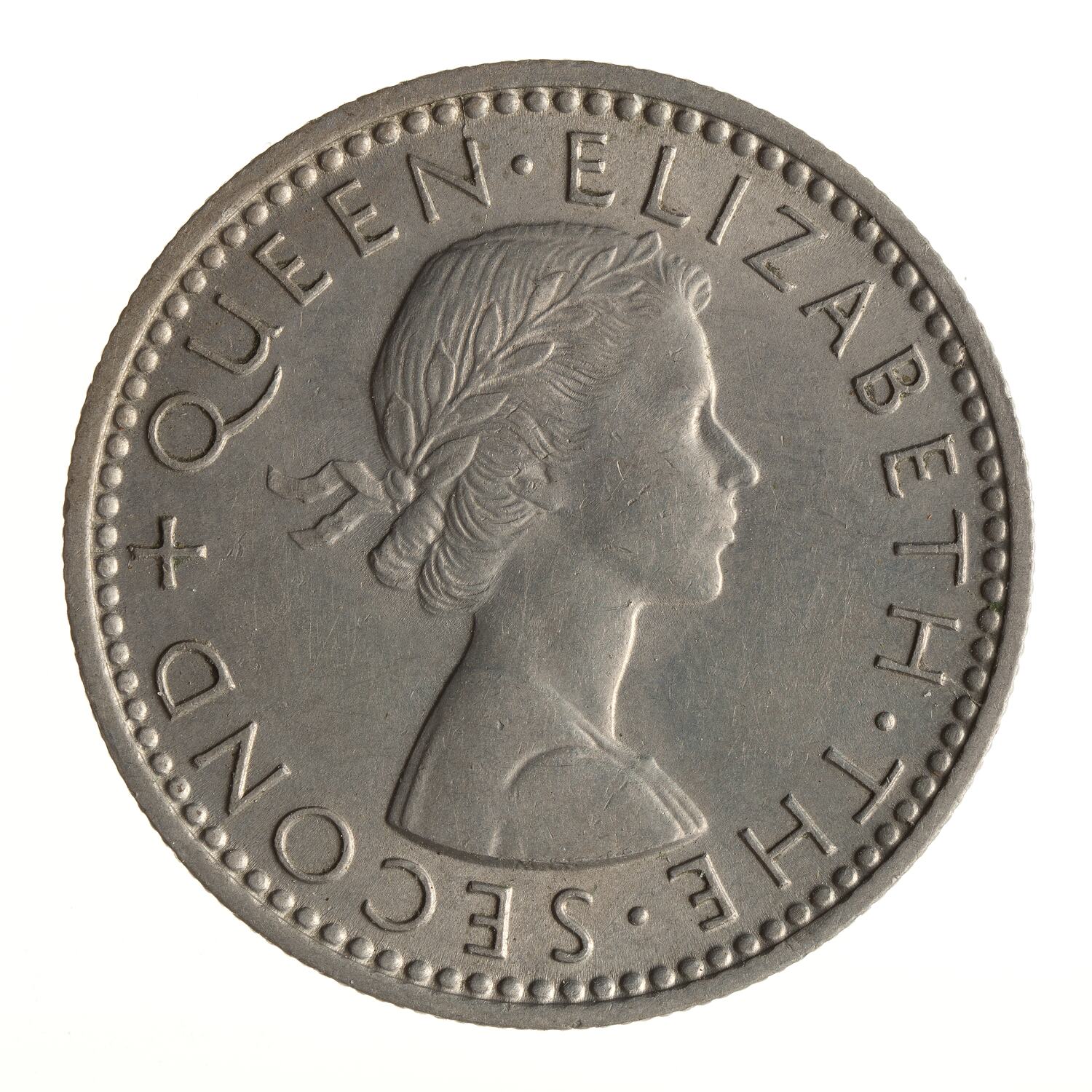 Laureate bust right; around, + QUEEN ELIZABETH THE SECOND; artist's initials incuse on neck truncation, MG (Mary Gillick)