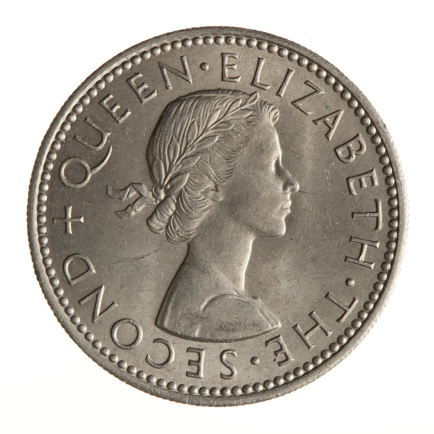 Laureate bust right; around, + QUEEN ELIZABETH THE SECOND; artist's initials incuse on neck truncation, MG (Mary Gillick)