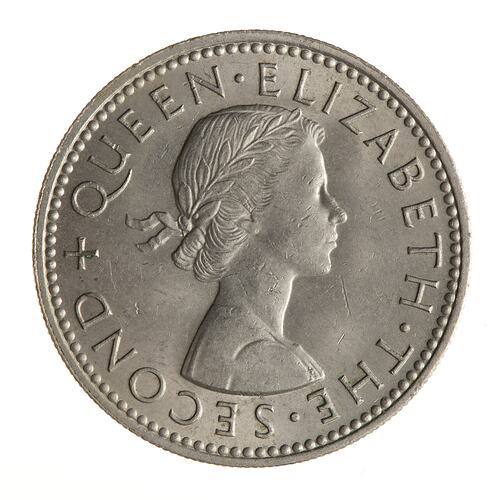 Laureate bust right; around, + QUEEN ELIZABETH THE SECOND; artist's initials incuse on neck truncation, MG (Mary Gillick)
