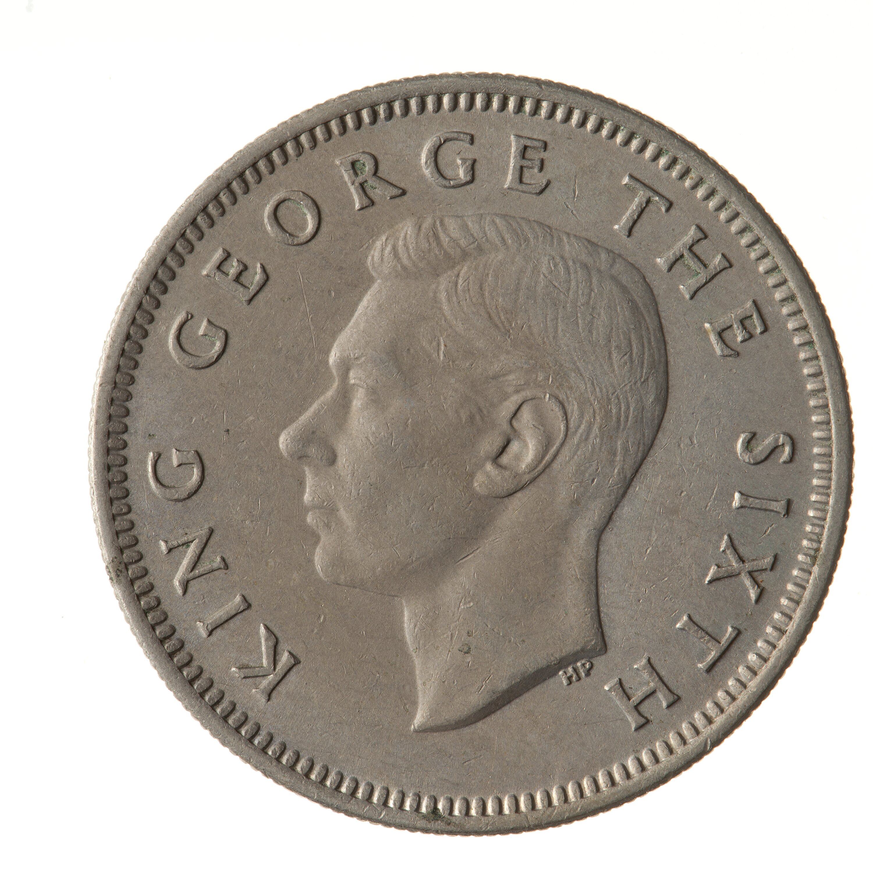 King's head, bare, facing left; around, KING GEORGE THE SIXTH; below neck truncation in small letters the artist's initials HP ([Thomas] Humphrey Paget)