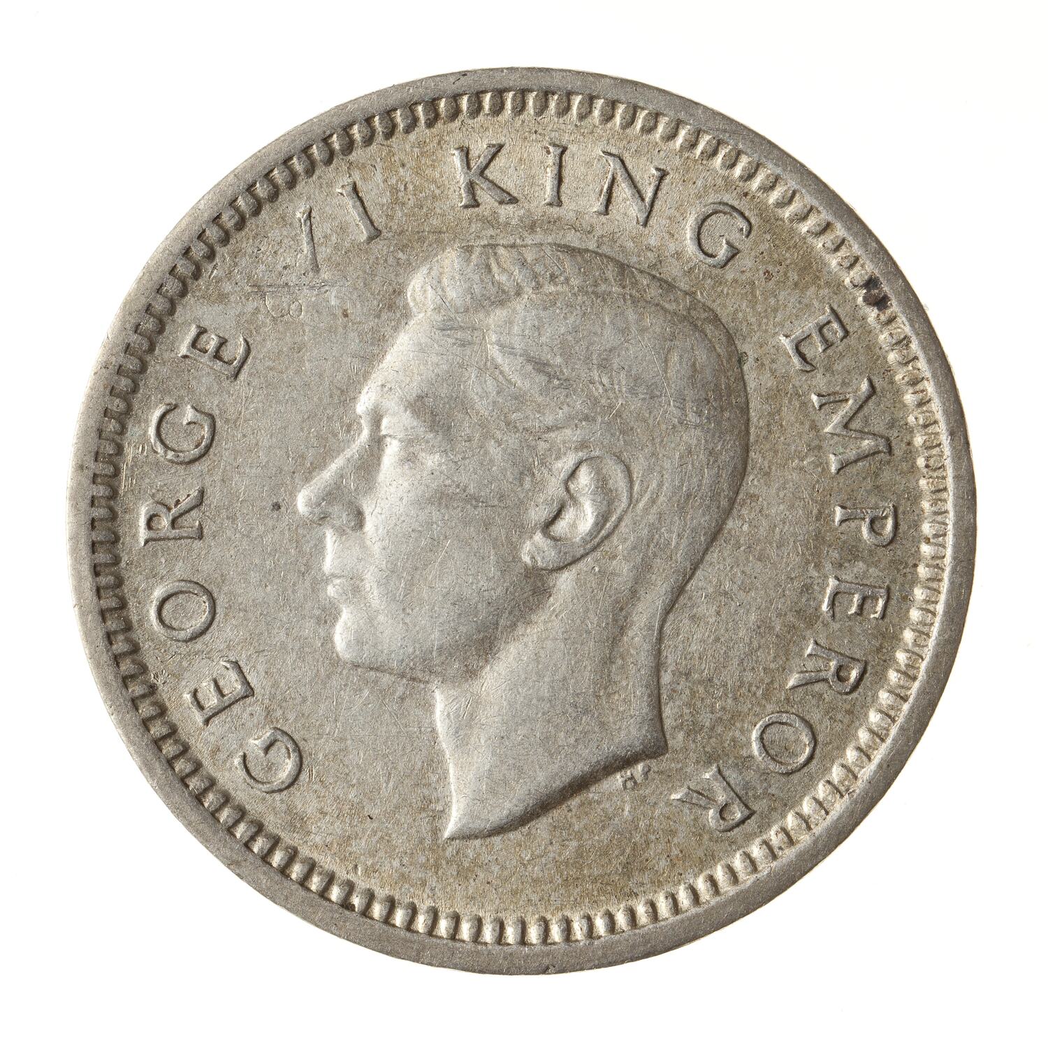 Head of King George VI facing left; around, GEORGE VI KING EMPEROR; below neck truncation the artist's initials HP (Hugh Paget)