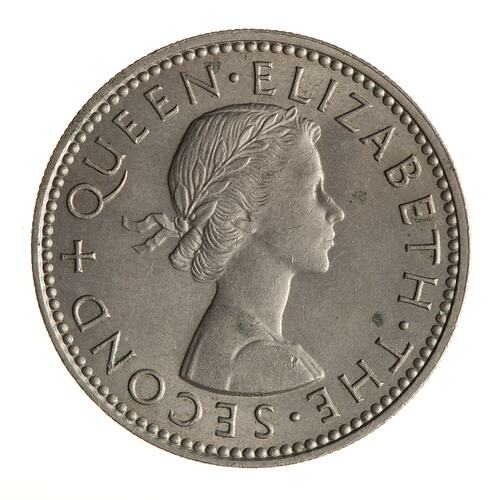 Laureate bust right; around, + QUEEN ELIZABETH THE SECOND; artist's initials incuse on neck truncation, MG (Mary Gillick)
