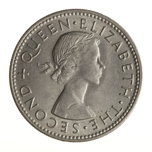 Laureate bust right; around, + QUEEN ELIZABETH THE SECOND; artist's initials incuse on neck truncation, MG (Mary Gillick)