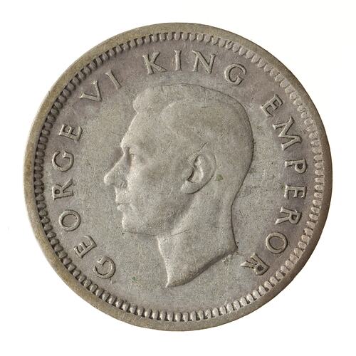 Head of King George VI facing left; around, GEORGE VI KING EMPEROR; below neck truncation the artist's initials HP (Hugh Paget)