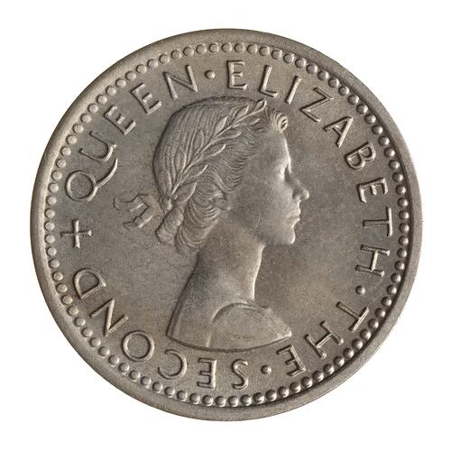 Laureate bust right; around, + QUEEN ELIZABETH THE SECOND; artist's initials incuse on neck truncation, MG (Mary Gillick)
