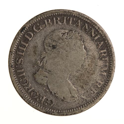 Laureate and draped bust of the King facing right; around, GEORGIUS III D: G: BRITANNIARUM REX