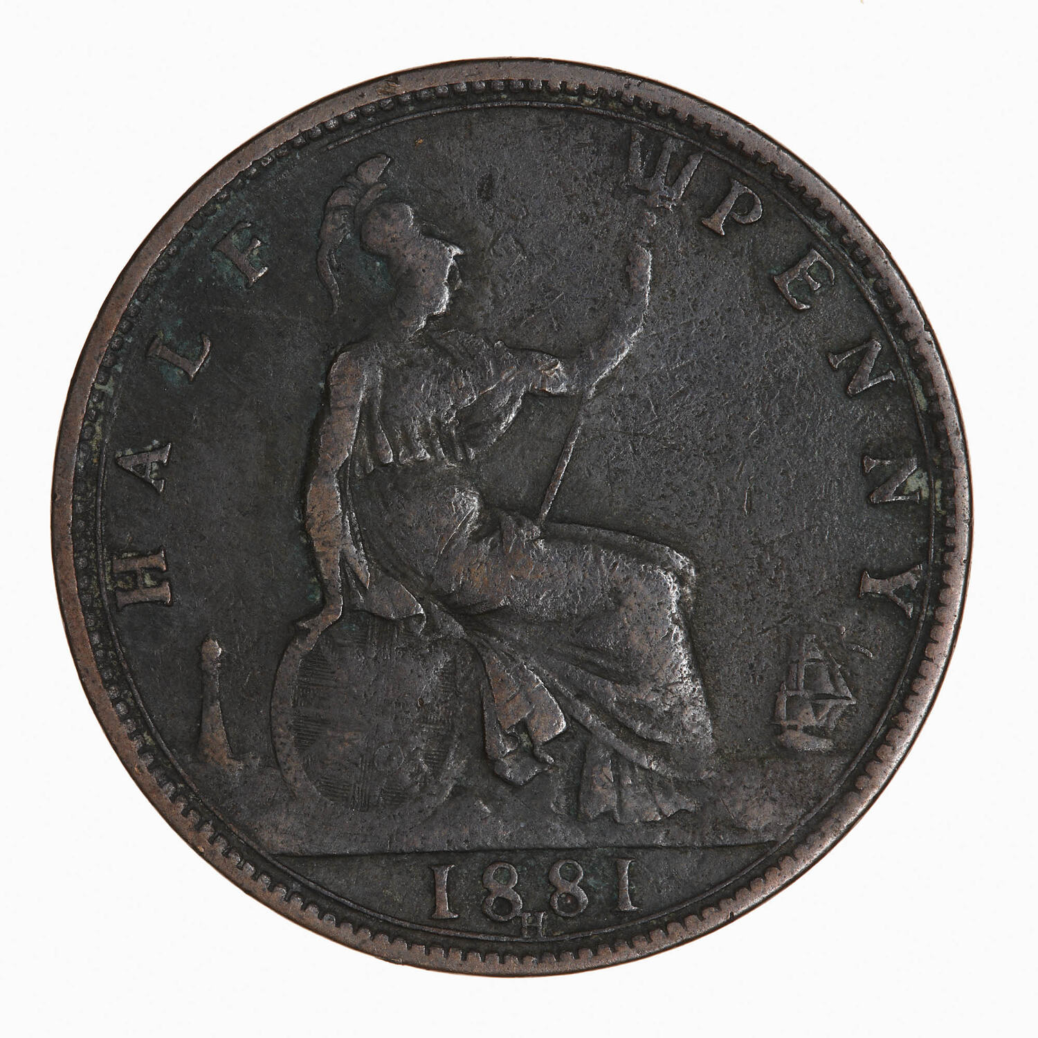Britannia seated facing right on a rock wearing a helmet and breastplate with flowing dress; she holds a trident and rests her right hand on a shield which bears the combined crosses of the Union Flag; at right a ship sailing away; at left, a lighthouse; around, HALF PENNY; in exergue, 1881; below date, H