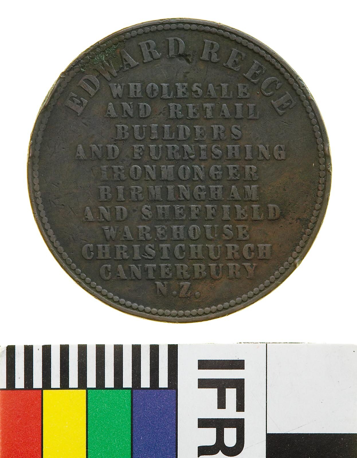 Obverse: EDWARD REECE WHOLESALE AND RETAIL BUILDERS AND FURNISHING IRONMONGER BIRMINGHAM AND SHEFFIELD WAREHOUSE CANTERBURY N.Z. Reverse: ADVANCE CANTERBURY NEW ZEALAND