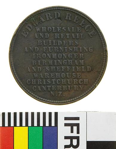 Copper One Penny Token, minted by Thomas Stokes, Melbourne. Issued by Edward Reece, Christchurch, circa 1860. Edward Reece was born in Shropshire, England, but left his father's farm to work in Birmingham's hardware trade. He bought stock there and then departed for New Zealand, arriving in 1855. He established his business the following year. He was sufficiently successful to open additional stores in Christchurch and Fiji. He managed his store until 1879 when he passed the business on to his son, William. He died in 1887.