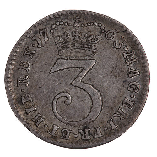 At centre a numeral 3 with crown above; around, MAG BRI FR ET HIB REX 1763 , the date being divided by the crown