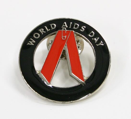 Enamelled metal pin comprised of black outer circle and inner shape of pink/red ribbon, with pin at top. Inscribed 'WORLD AIDS DAY'. Produced for an AIDS Awareness Campaign. Manufacturer unknown.