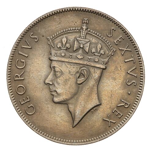 Within a partial line circle which ends in leaves either side of the denomination, a lion advancing to right with a tall pointed mountain in the background; in exergue in three lines, 1 / SHILLING / 1948; around above, EAST AFRICA