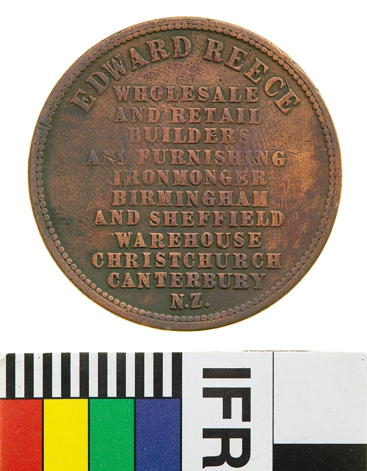 Obverse: EDWARD REECE WHOLESALE AND RETAIL BUILDERS AND FURNISHING IRONMONGER BIRMINGHAM AND SHEFFIELD WAREHOUSE CANTERBURY N.Z. Reverse: ADVANCE CANTERBURY NEW ZEALAND