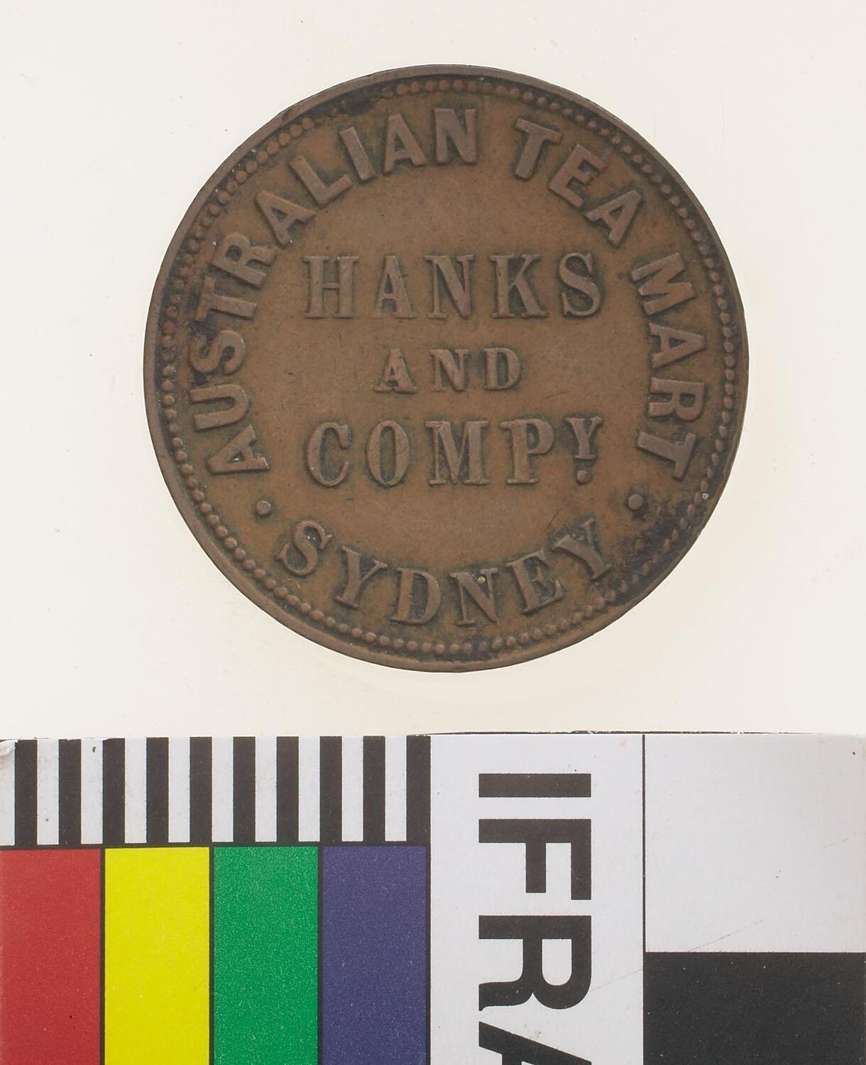 A round copper token (28 mm dia) featuring the name and business of the issuer: Hanks and Co., Australian Tea Mart Sydney The reverse features an Arms of New South Wales supported by a kangaroo and emu.