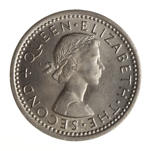 Laureate bust right; around, + QUEEN ELIZABETH THE SECOND; artist's initials incuse on neck truncation, MG (Mary Gillick)