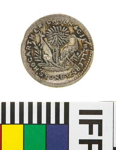 A round silver token (16 mm dia) featuring the name and business of the issuer: Hogarth, Erichsen and Co., Jewellers Sydney around a kangaroo and emu standing either side of a small palm The reverse features the denomination "3" within an oak wreath and the date. This token is worn and has a flan crack.
