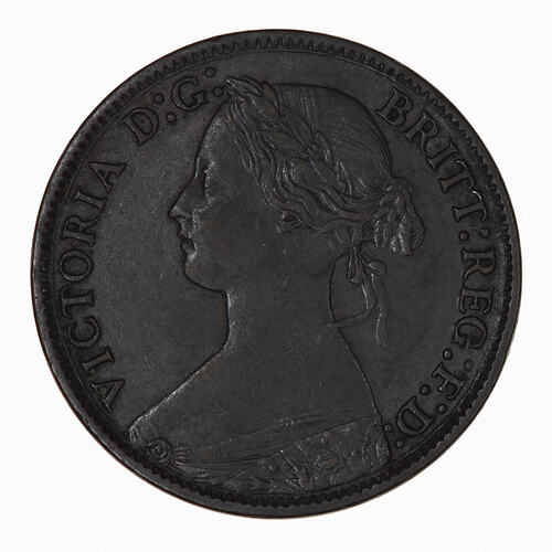 A farthing is a quarter penny. The bronze farthing replaced the earlier and larger copper farthing in 1860. This coin was current in all Australian colonies.