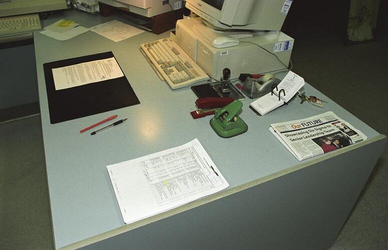 Photographic print showing operator's desk, with computer and office equipment, including Department of Transport stamp, at the Melbourne Coastal Radio Station, Cape Schanck, Victoria.