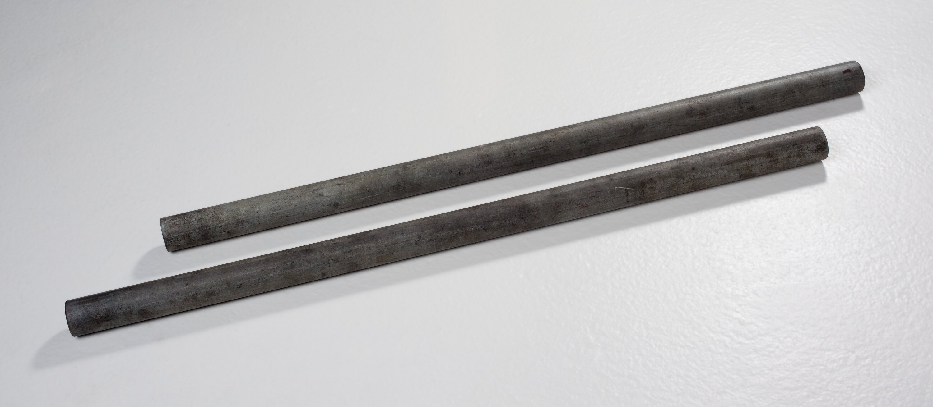 Handles for turning mechanism of a grape or wine press known as a Torchio, made circa 1960s. These hollow metal tubes can be slotted over the existing metal turnscrew to lengthen them and hence increase leverage. This grape press was used in domestic wine production by the Di Benedetto family at their home in Thornbury, from the 1960s to 1991. In the early years the wine making was very much a family affair, with everyone contributing to the annual ritual. As the family dispersed, Vito di Benedetto continued to make wine once every three years, with the assistance of Maria and often his daughter Angela, until his death in 1991.