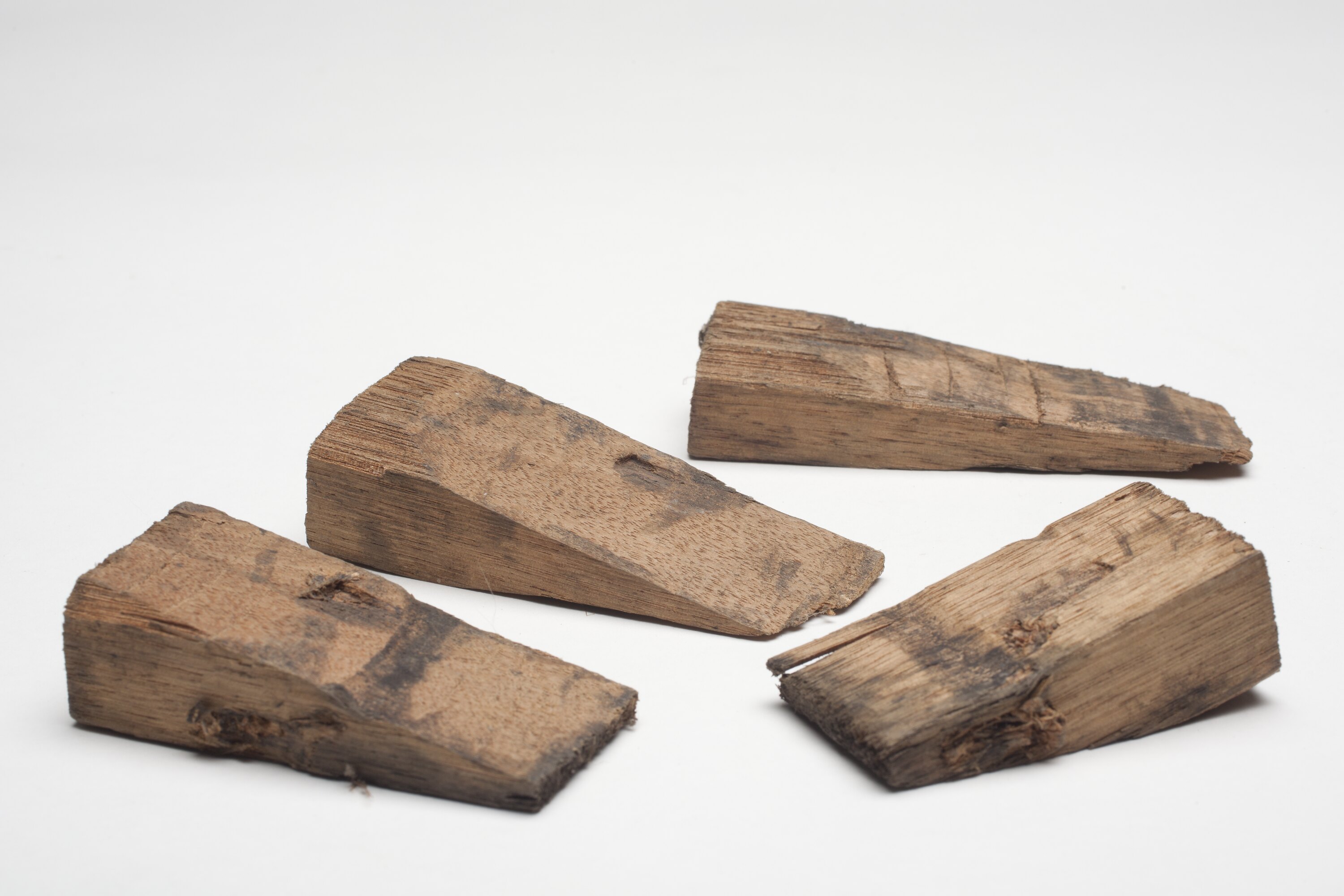 Twenty wooden block weights used with a grape or wine press known as a Torchio, made circa 1960s. This grape press was used in domestic wine production by the Di Benedetto family at their home in Thornbury, from the 1960s to 1991. In the early years the wine making was very much a family affair, with everyone contributing to the annual ritual. As the family dispersed, Vito di Benedetto continued to make wine once every three years, with the assistance of Maria and often his daughter Angela, until his death in 1991.
